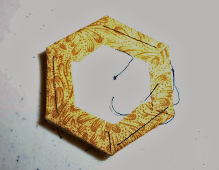 | With a knotted threaded needle (use a contrasting thread color) and fold over the first corner. Beginning at the front of the hexagon, insert the needle for the first stitch. This will be your starting and ending spot. I use a double strand of thread--you can use a single strand if you wish. I prefer you do not use any red thread for basting your hexies. |